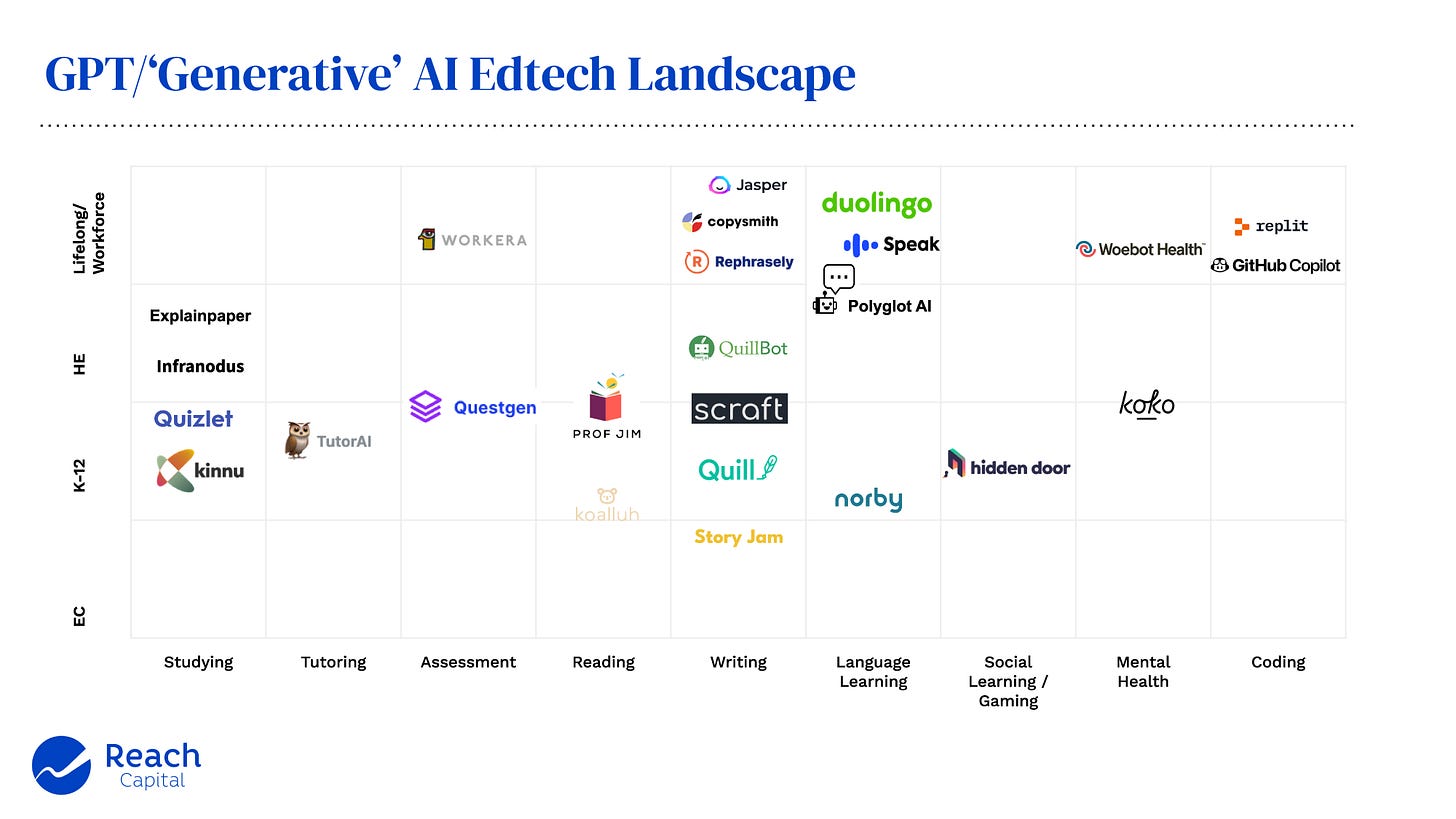 The following is a survey of the GPT and ‘Generative’ AI edtech landscape first published on the Reach Capital blog.